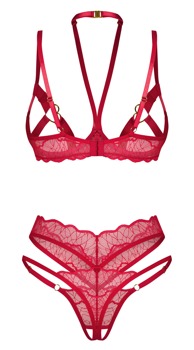 Ouvert-Set Cupide Desir von Obsessive mit BH und String. Filigrane Spitzen-Optik in sinnlichem Rot mit goldfarbenen Details. Weich und elastisch für hohen Tragekomfort. BH mit modischem, verstellbarem Neckholder. Zwischen den offenen Cups mit dezentem Schmuckdetail. Die Cup-Riemen mit den Schmuckherzen für die Nippel sind z. T. verstellbar. Auch die Träger sind passend verstellbar. Der aufwendige String verführt mit stylischem Doppelbund. Die schmalen Seitenriemen sind verstellbar. Im Schritt verführerisch offen.