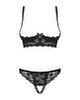 Set Letica von Obsessive mit Bügel-Hebe und String ouvert. Aus bildschöner schwarzer Spitze – rundum weich und elastisch für hohen Tragekomfort. Die Bügel-Hebe stützt den freiliegenden Busen perfekt. Das Schmuckelement zwischen den Cups fängt den Blick. Der Hakenverschluss im Rücken und die Träger sind passend verstellbar. Der schöne String ist im Schritt einladend offen.