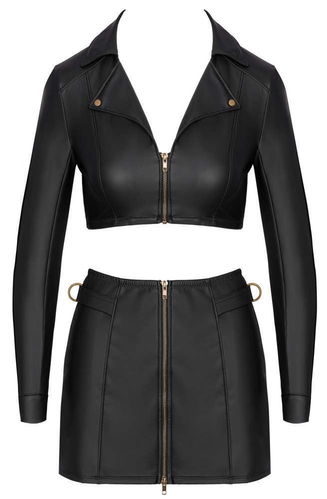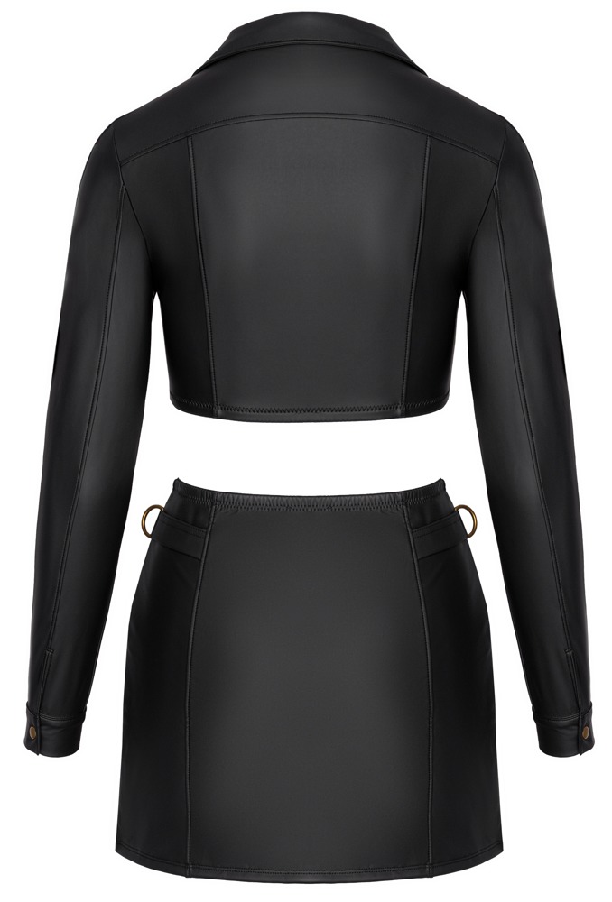 Clubwear-Set von Cottelli PARTY mit kurzem Jacken-Top und Minirock im schwarzen Mattlook mit messingfarbenen Details. Rundum weich und elastisch anschmiegsam für hohen Tragekomfort. Bauchfreies, enganliegendes Jacken-Top mit kurzem durchgehendem Reißverschluss vorne. Dazu dekorative Nieten am Reverskragen und Druckknöpfe an den Ärmelbündchen. Der schmale Minirock punktet mit durchgehendem 2-Wege-Reißverschluss vorne und seitlichen Ringen am elastischen Bund.