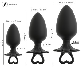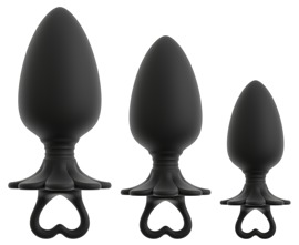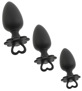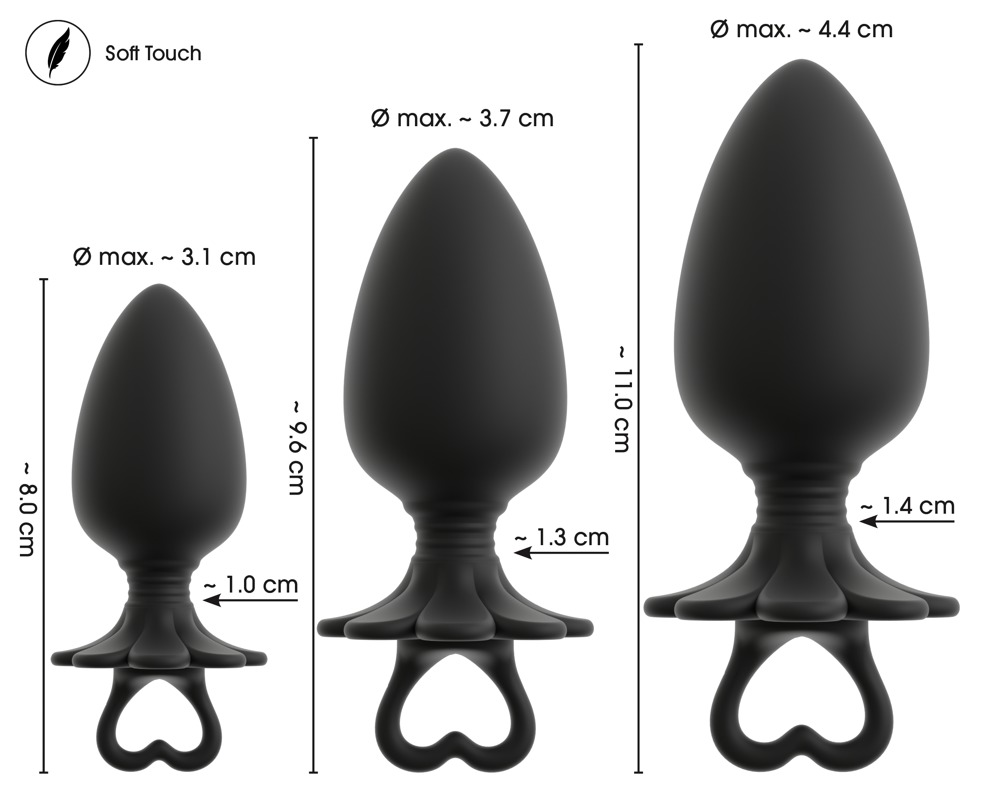 anal-plug-set von Accessoire Bizarre mit 3 schwarzen Silikon-Plugs in verschiedenen Größen und Gewichten. Perfekt für rektale Stimulation und Dehntraining. Jeder bauchige, glatte Plug mit einfühlsamer Spitze. Der dekorative Blütenstopper sorgt für analsicheren Sitz – der herzförmige Griff für genussvolles Spielen und Herausziehen. Alle drei Analplugs sind angenehm flexibel und aus Silikon mit seidig softer Oberfläche gefertigt. Für leichtes Einführen, optimale Anpassung und höchsten Komfort beim Backdoor-Spaß!