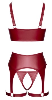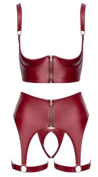 Aufregendes Ouvert-Set von Cottelli LINGERIE mit busenfreier Hebe, schrittoffenem String und Strapsgürtel mit Schenkelriemen. Edler bordeauxroter Mattlook verführerisch in Szene gesetzt mit goldfarbenen Ringen und Zips. Rundum weich und elastisch für hohen Tragekomfort. Sowohl Hebe als auch Strapsgürtel haben vorne einen durchgehenden dekorativen Reißverschluss. Die länger geschnittene Hebe bringt mit ihren leicht gefütterten Bügel-Cups den Busen in Hochform. Die Träger sind passend verstellbar. Der Strapsgürtel verführt mit fest angebrachten Schenkelriemen, die ebenfalls passend verstellbar sind. Der String ist im Schritt komplett offen.