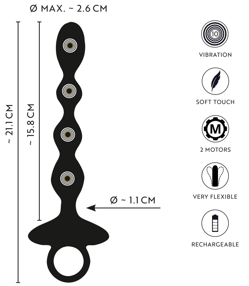 Flexible Anal Beads with Jumping Vibrations von ANOS für tiefgehenden intensiven Backdoor-Spaß. Der flexible Analstrang stimuliert mit 4 rillenstrukturierten Vibro-Kugeln. Gleich 2 Motoren sorgen für 10 starke Vibrationsmodi, die per Knopfdruck bequem gesteuert werden. Auch der Spezial-Modus für die Jumping Vibrations, bei dem die Impulse von einer Vibro-Kugel zur nächsten springen. Für aufregende Überraschungseffekte beim analen Spiel!