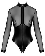 Schwarzer Langarm-Body Project Fetish von Noir im edlen Mix aus transparentem feinem Powernet (Oberteil) und anschmiegsamem Mattlook. Weich und elastisch für hohen Tragekomfort. Der Reißverschluss führt vom Stehkragen durch den Schritt bis über den Po. Eyecatcher sind die beiden großen Ringe, die vorne auf Brusthöhe dekorativ platziert sind und aufregende Nippel-Piercings simulieren.