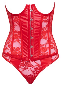 Busenfreie Corsage und String im Set von Cottelli LINGERIE. In feurigem Rot und feinem Materialmix aus Spitze und Wetlook. Rundum elastisch und weich anschmiegsam für hohen Tragekomfort. Corsage mit Cup-Bügeln zur leichten Unterstützung der freiliegenden Brüste. Pro Seite mit 6 eingearbeiteten Formstäben. Vorne mit Hakenverschluss, im Rücken mit Spitze unterlegte Satinband-Zierschnürung. Der dazu passende Riostring ist komplett aus Spitze gearbeitet.