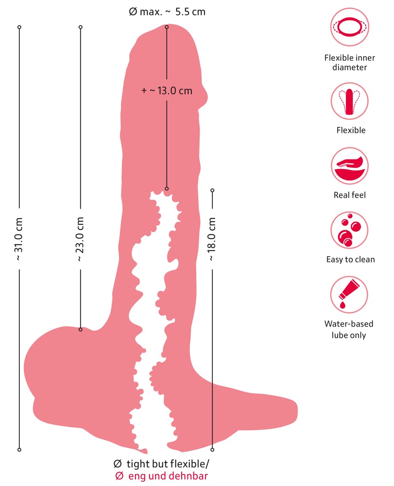 Der Penis lässt sich in den hohlen, dehnbaren Naturdildo bzw. in die Vagina leicht einführen. Im engen Inneren stimulieren authentische Reizstrukturen bei jedem Stoß. Man kann mit dem Prachtdildo ausgestattet auch den Partner oder die Partnerin tief ausfüllend beglücken – der eigene Penis wird um satte 13 cm verlängert und spürbar verdickt. Selbstverständlich kann man den flexiblen Naturdildo auch pur genießen. Intensive Stimulation und flexible Einsatzmöglichkeiten vereinen sich zu maximalem Lustgewinn.