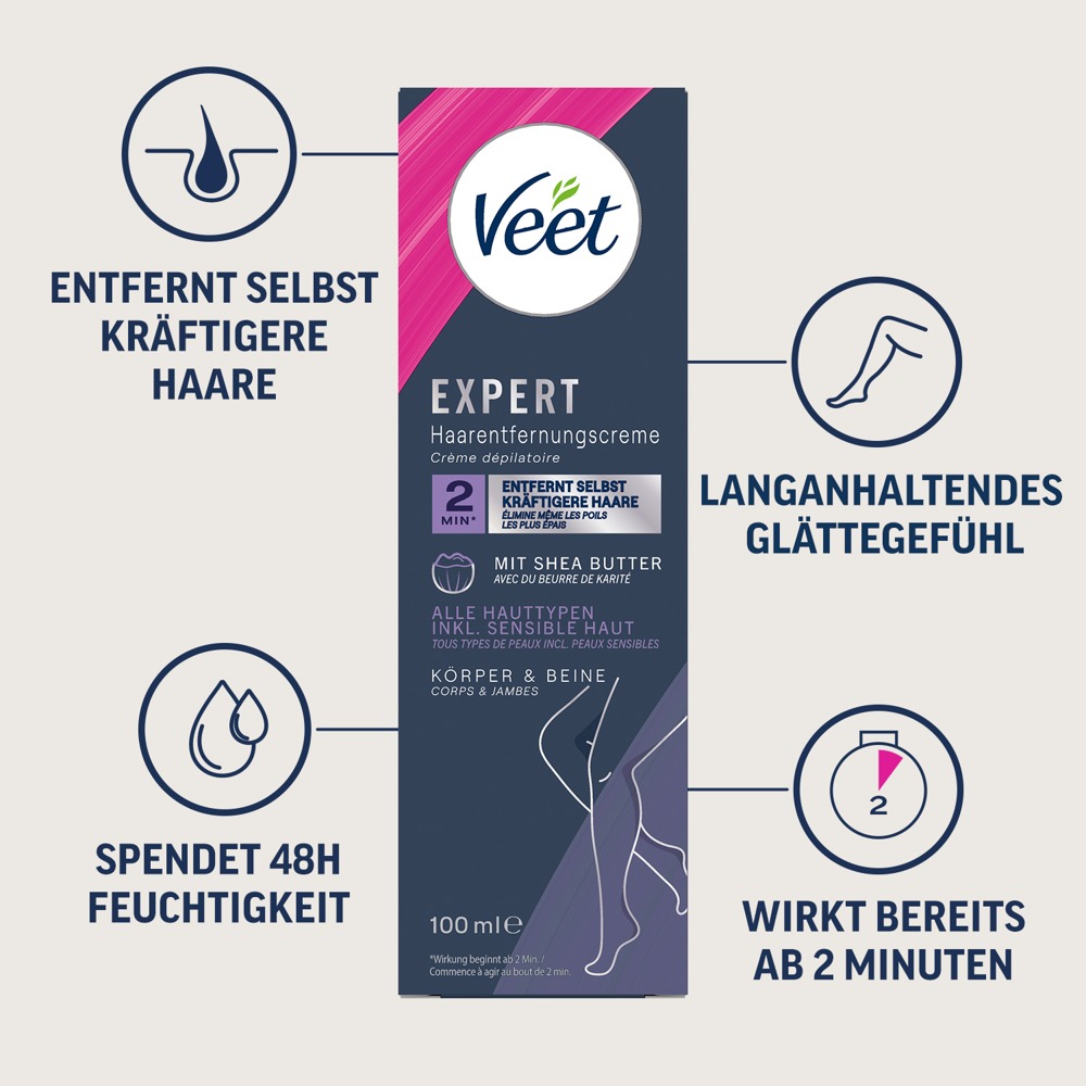 Die Veet EXPERT Enthaarungscreme entfernt unerwünschte Körperhaare schnell und effektiv, auch bei kräftigerem Haar. Die hocheffiziente Rezeptur wirkt bereits ab 2 Minuten und eignet sich besonders für die Anwendung an Beinen und Armen. Dank der geschmeidigen Konsistenz lässt sich die Creme leicht und gleichmäßig auftragen. Die dermatologisch getestete Formel ist für alle Hauttypen geeignet – auch sensible Haut. Sie enthält pflegende Shea Butter, die die Haut bis zu 48 Stunden mit Feuchtigkeit versorgt. Nach der Anwendung bleibt die Haut angenehm zart, frei von lästigen Stoppeln, Schnittverletzungen und unangenehmen Gerüchen. Das Ergebnis ist langanhaltend glatte Haut – ganz ohne großen Aufwand.