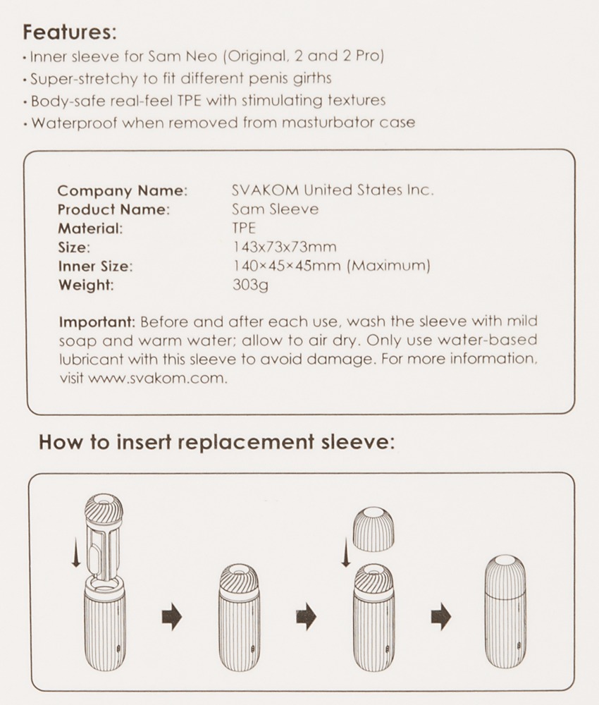 Durch den Austausch der aufregend strukturierten Innensleeve ist eine hygienische Benutzung und der maximale Genuss durchgehend gesichert. Für eine langfristige und nachhaltige Nutzung des Masturbators Sam Neo!
