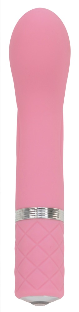 Schlanker Racy Luxurious Mini Massager von Pillow Talk mit gebogenem Schaft und Reizrillen. Für besonders intensive und präzise Vibrationen wurde die Schaftspitze mit einem kraftvollen PowerBullet-Motor ausgestattet, der den vaginalen G-Punkt und auch alle äußeren Lustpunkte mit tieffrequenten Schwingungen verwöhnt – stufenlos regulierbar mit der Multispeed-Funktion. Auch die Optik lässt keine Wünsche offen: Das untere Schaftende wurde mit einer angesagten Steppmuster-Optik und einem silberfarbenen Zier-Ring ausgestattet. Dazu erfolgt die Steuerung über einen großen Swarovski®-Kristall auf der Unterseite. Mit praktischer Reisesperre.