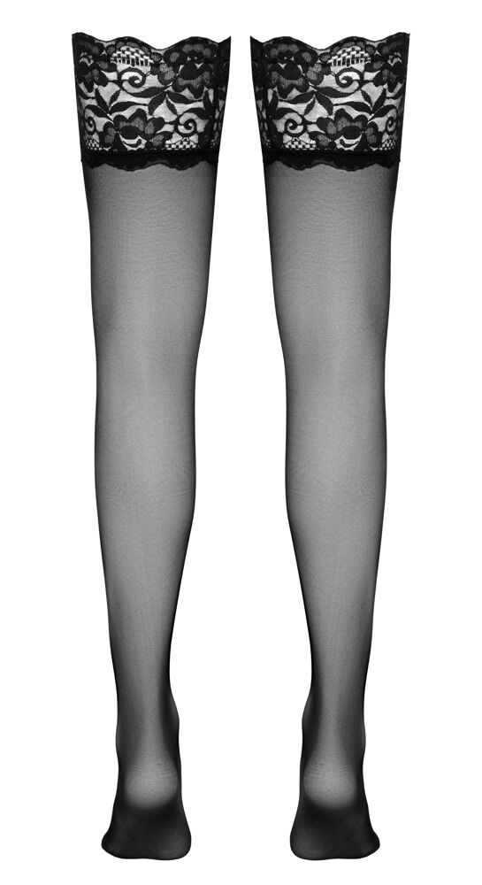 Halterlose Strümpfe mit einem 12 cm breiten Spitzenabschluss. Innen mit Silikonbändern für einen rutschfestem Sitz. 20 den.