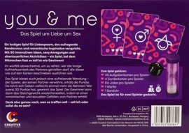 Das aufregende Pärchenspiel you & me mit 90 innovativen erotischen Ideen, sexy Anregungen und abenteuerlichen Aktivitäten. Bei diesem raffinierten Spiel ist das Mitmachen genauso aufregend und stimulierend wie das Gewinnen!