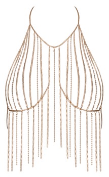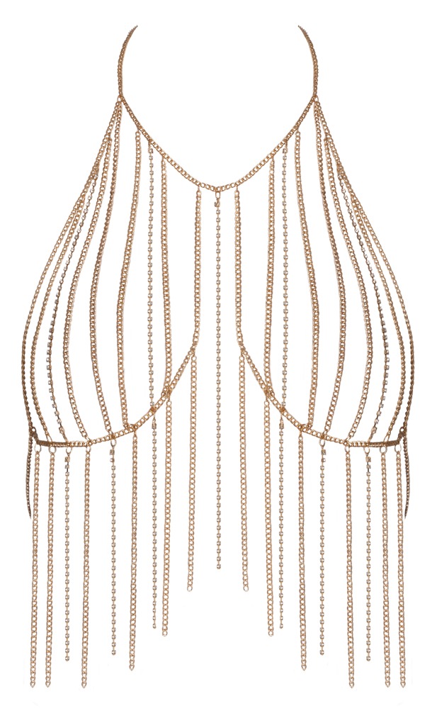 Goldfarbenes Ketten-Top von Cottelli ACCESSOIRES z. T. mit Strassbesatz. Glamouröses Schmuckstück mit individuell verstellbarem Karabinerverschluss im Nacken und im komplett freien Rücken. Pur auf der Haut getragen ein stilvoll erotischer Look. Der schillernde Kettchen-Look lässt sich auch stylisch mit Bademode oder enganliegenden Outfits kombinieren.