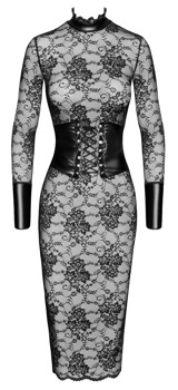 Knieumspielendes, enganliegendes Midikleid Kink Royal von Noir in atemberaubender Transparenz. Komplett aus schwarzer Spitze mit extravaganten Details im Powerwetlook: Extrabreite Manschetten, edler Stehkragen und eine eingenähte Taillencorsage, dessen Schnürung individuell anpassbar ist. Im Rücken mit elegantem Ausschnitt und im Nacken mit Häkchenverschluss. Rundum elastisch und weich anschmiegsam für hohen Trage- und Bewegungskomfort.