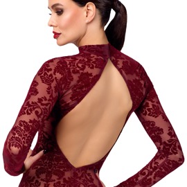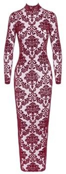 Tailliertes, knöchellanges Langarm-Kleid Kink Royal von Noir in atemberaubender burgundroter Transparenz mit samtigen Flockprint-Ornamenten. Rundum elastisch und weich anschmiegsam für hohen Trage- und Bewegungskomfort. Im Rücken mit großzügigem Ausschnitt, eleganter Stehkragen mit Häkchenverschluss im Nacken. Der extrahohe Gehschlitz hinten im hautengen Kleid gewährleistet optimale Bewegungsfreiheit und setzt verführerisch in Szene.