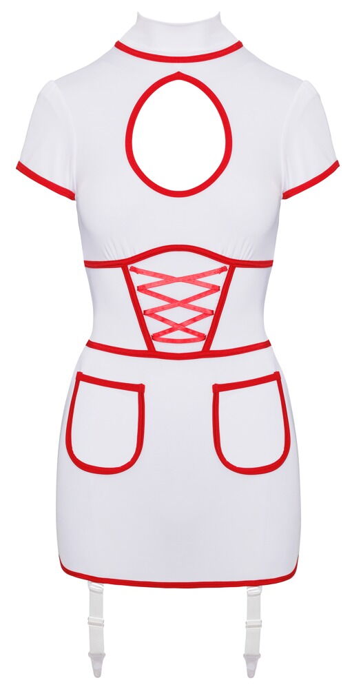 Semi-transparentes kurzes Strapskleid im Krankenschwester-Look von Cottelli COSTUMES in Weiß mit kontrastierenden roten Details. Rundum elastisch in enger figurnaher Schnittführung mit halbem Arm und großem Cut-out im Dekolleté. Vorne zwei aufgesetzte Taschen und Powernet-Einsatz unter dekorativer Zierschnürung. Stehkragen mit 2 Knöpfen im Nacken. Die verstellbaren Strumpfhalter sind auch komplett abnehmbar.