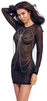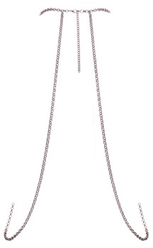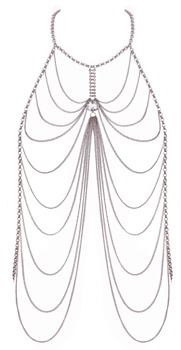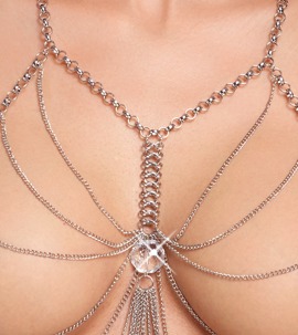 Silberfarbene Körperkette von Cottelli ACCESSOIRES mit üppigem Kettchenbesatz vorne. Als zusätzlicher Eyecatcher ein großer klarer Schmuckstein zwischen den Brüsten. Neckholder mit Karabinerverschluss. Ob solo als Dessous getragen für einen erotischen Auftritt oder mit Bademode und enganliegenden Outfits stylisch kombiniert – der glamouröse Körperschmuck ist stets ein Blickfang!