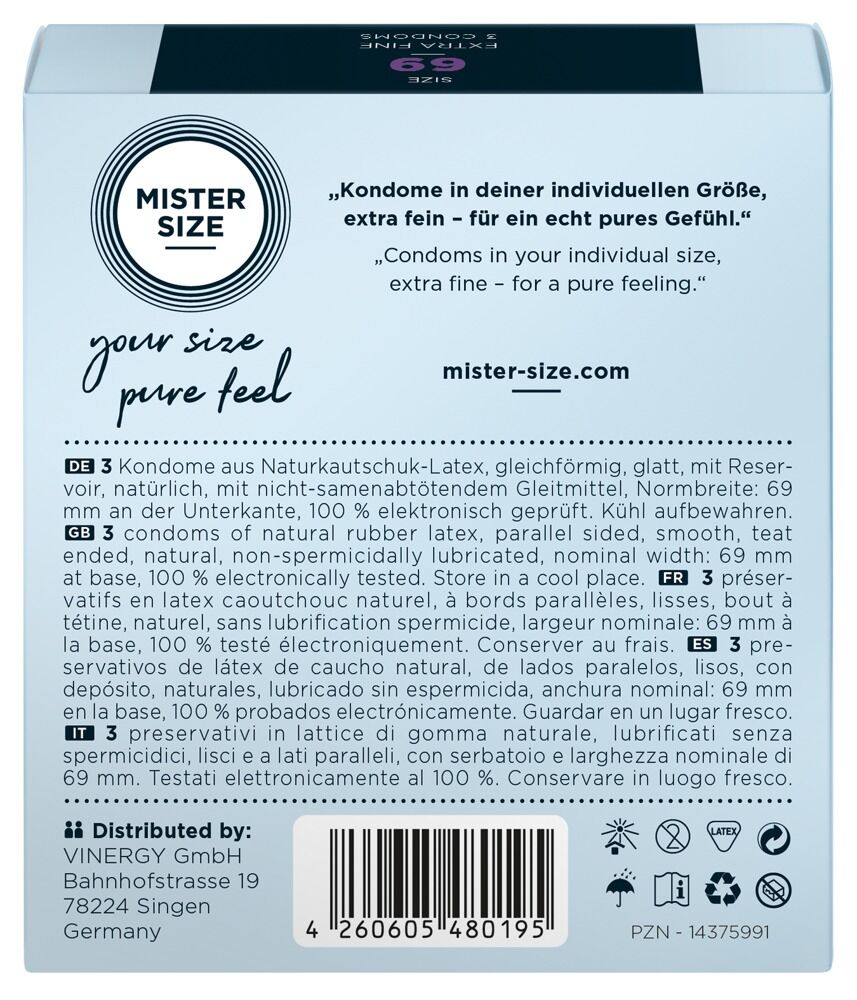 Die Marke Mister Size verspricht Dir hauchdünne und gefühlsechte Kondome, die beim Tragen kaum spür- oder fühlbar sind. Nutze Mister Size Smart übers Handy oder drucke das Mister Size Maßband aus, um Deine optimale und individuell abgemessene Kondomgröße zu bestimmen. Die Passform der transparenten Kondome ist wie für Deinen Penis gemacht, damit sie Dir einen rutschfesten Sitz sowie absolute Sicherheit beim Sex bietet. Für jeden Penis das richtige Kondom! Weitere Details Über Mister Size