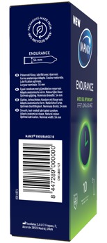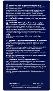 Aktverlängernde, feuchte Kondome Endurance von MANIX innen mit Verzögerungsgel (enthält 4,5% Benzocain) beschichtet. Kann die Empfindlichkeit reduzieren und somit die Erektionsdauer verlängern für ein ausdauerndes Liebesspiel. Zylindrische Form mit Reservoir.