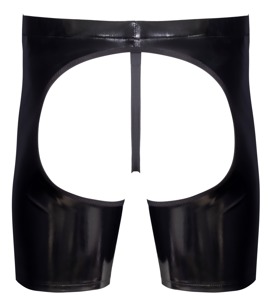 Schwarz-glänzende, leicht elastische Lack-Chaps von Black Level inklusive Lack-String. Chaps mit engem langem Bein, komplett offen im Schritt und po-frei. Mit elastischem Gummizug im Bund, vorne ein dekorativer Ring. Lack-String mit Webgummibund.