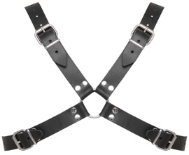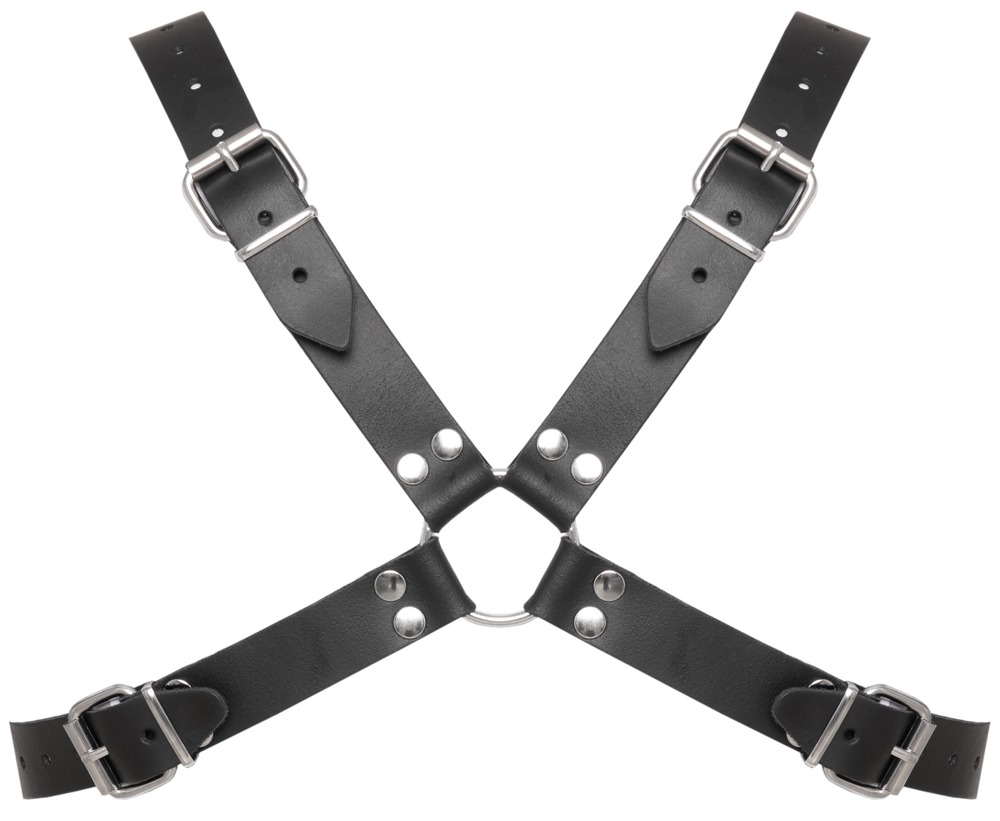 Dieses schwarze Brustharness von ZADO aus hochwertigem, sorgfältig verarbeitetem Leder überzeugt durch seine markanten Kuppel-Ziernieten, silberfarbenen Metallschnallen und soliden Ringe. Das robuste X-Harness besticht mit exklusiver Optik und hoher Langlebigkeit. Die mehrfach verstellbaren Lederriemen mit praktischen Schnallenverschlüssen ermöglichen eine flexible Anpassung für perfekten Sitz und maximalen Tragekomfort. Ob direkt auf der Haut oder als stilvolles Accessoire über einem Shirt – dieses Brustgeschirr zieht alle Blicke auf sich!