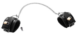 Hochwertige, robuste Fußfesseln von ZADO aus schwarzem Leder mit silberfarbenen Accessoires. Mit Schnallenverschlüssen passend verstellbar. Sorgfältig gearbeitet und genäht, innen mit Glattleder weich gepolstert. Inklusive schrittlanger Karabinerkette zum Verbinden der Fesselmanschetten sowie 2 goldfarbenen Schlössern mit Schlüsseln zum Arretieren der Verschlüsse.