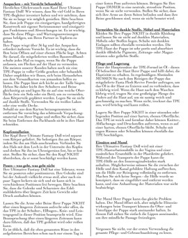 Größe 168 cm. Gewicht 37,19 kg. Brust 90 cm, Taille: 52 cm, Hüfte 81 cm. Kleidung: XS. Körbchengröße: DD. Schuhgröße (Euro) 37-38. Einführtiefe Vaginal = Anal = Oral 12,7 cm. Spritzwassergeschützt.