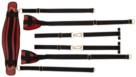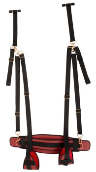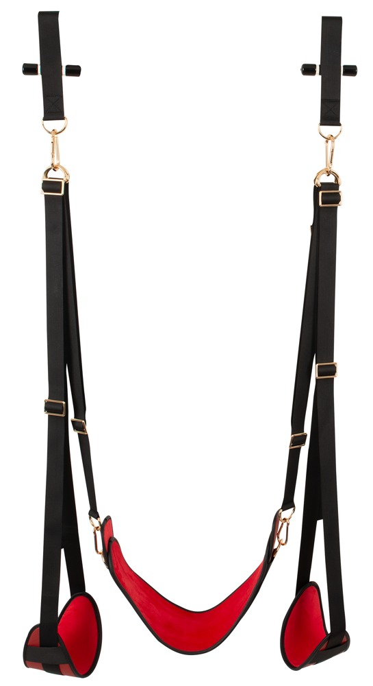 Die Door Swing von Bad Kitty präsentiert sich luxuriös und stilvoll mit schwarzen Gurten, roten Komfort-Polstern aus feinem Lederimitat und goldfarbenen Accessoires. Ein echtes Highlight für leidenschaftliche Höhenflüge! Sie ermöglicht neue schwebende Sexstellungen mit optimaler Unterstützung, sicherem Halt und Komfort.