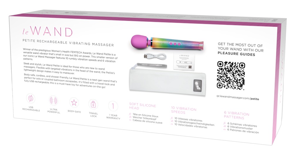 Wiederaufladbarer Luxus-Massagestab Petite Rechargeable Vibrating Massager All That Glimmers von le WAND für intensive Solo- und Paarmassagen. Wild, bunt und kreativ – die Special Edition in glitzernden Regenbogenfarben! 6 Vibrationsmodi in 10 Intensitäten sorgen für individuellen und vielseitigen Massagespaß und sind mit der 3-Button-Steuerung am Griff bequem steuerbar. Sogar in Bad und Dusche, denn der Massagestab ist wasserdicht. Dazu mit praktischer Tastensperre ausgestattet für diskreten Transport und Aufbewahrung.