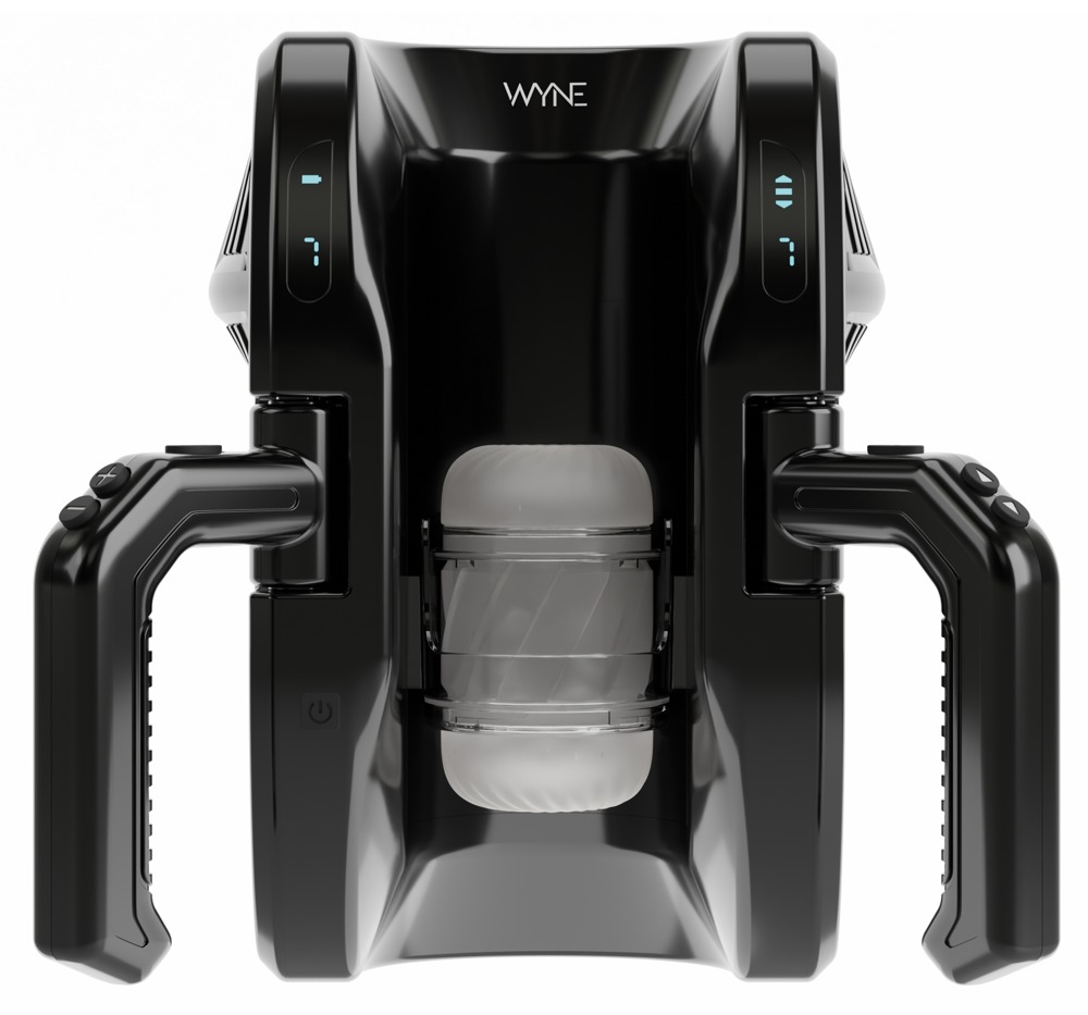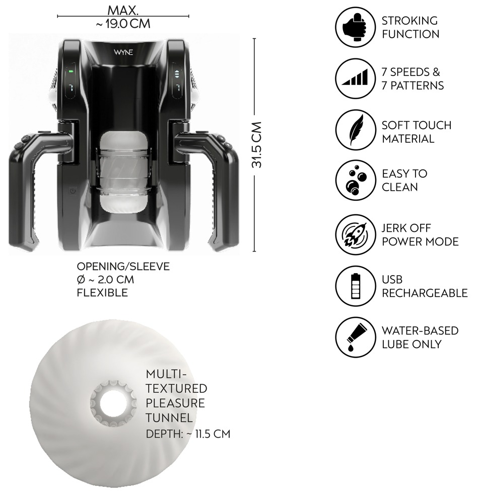 Leistungsstarker Masturbator 10 von WYNE, der den Penis in der sich Auf-und-Ab-bewegenden Stroker-Sleeve intensiv massiert und verwöhnt – über die gesamte Länge bis 28 cm. Die praktischen Griffe an den Seiten bieten dabei maximalen Nutzungskomfort und eine super einfache Handhabung. Vollautomatischer Komfort-Handjob ohne müde Hände!
