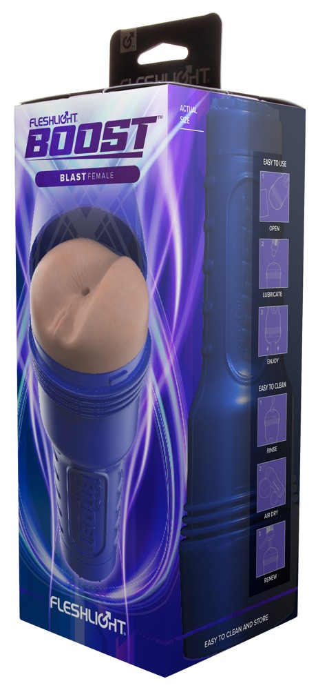 Griffiger Masturbator Boost Blast von Fleshlight in diskretem Gehäuse mit lebensecht detaillierter Anus-Öffnung. Innenliegende schwebende Turbo Tech Ringe umschließen den Penis schön fest und sorgen für perfekten Halt. Das sehr abwechslungsreich strukturierte Innenleben mit verschiedenen Durchmessern massiert den Penis intensiv und orgasmuswirksam beim Handjob. Mit der beiliegenden Suction Control Cap kann bequem die Saugwirkung individuell gesteuert werden.