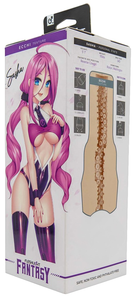 Griffiger Masturbator Fantasy Sasha Nakamoto Ecchi von Fleshlight in diskreter, lilafarbener Taschenlampen-Optik mit Schutzdeckel. Mit originalgetreuer Vagina-Öffnung des verführerischen Succubus-Anime. Innen intensive Tentakel-Reizstrukturen mit verschiedenen Durchmessern für eine orgasmuswirksame Massage beim Handjob.