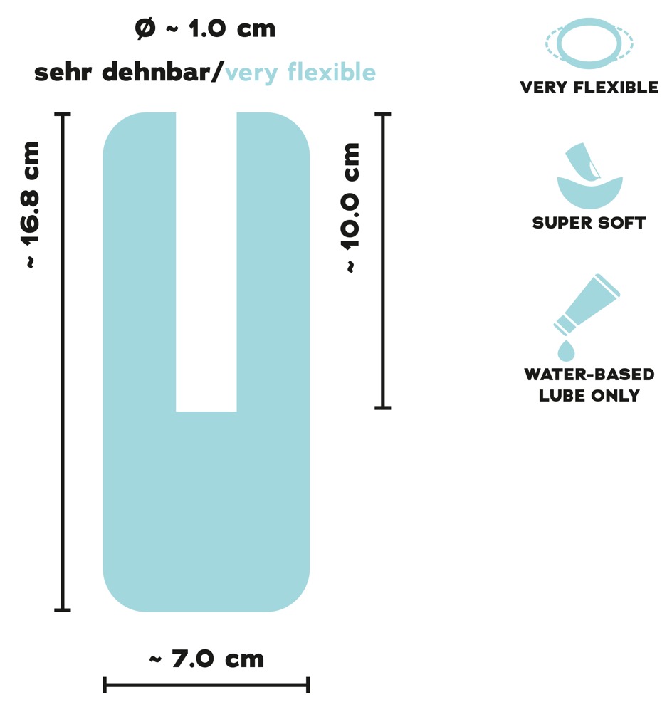 Gesamtlänge 16,8 cm, Einführtiefe 10 cm, Außen-Ø 7 cm, Innen-Ø 1 cm (dehnbar).
