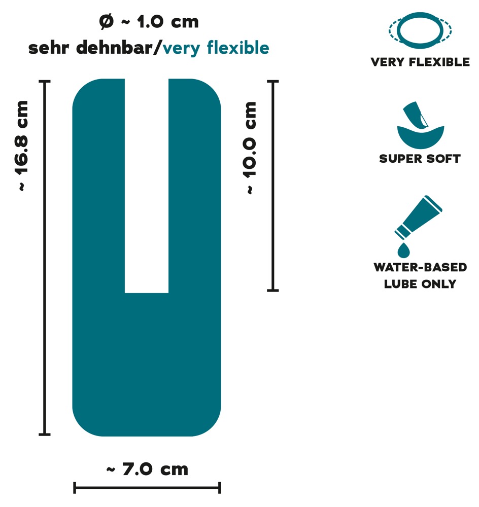 Gesamtlänge 16,8 cm, Einführtiefe 10 cm, Außen-Ø 7 cm, Innen-Ø 1 cm (dehnbar).