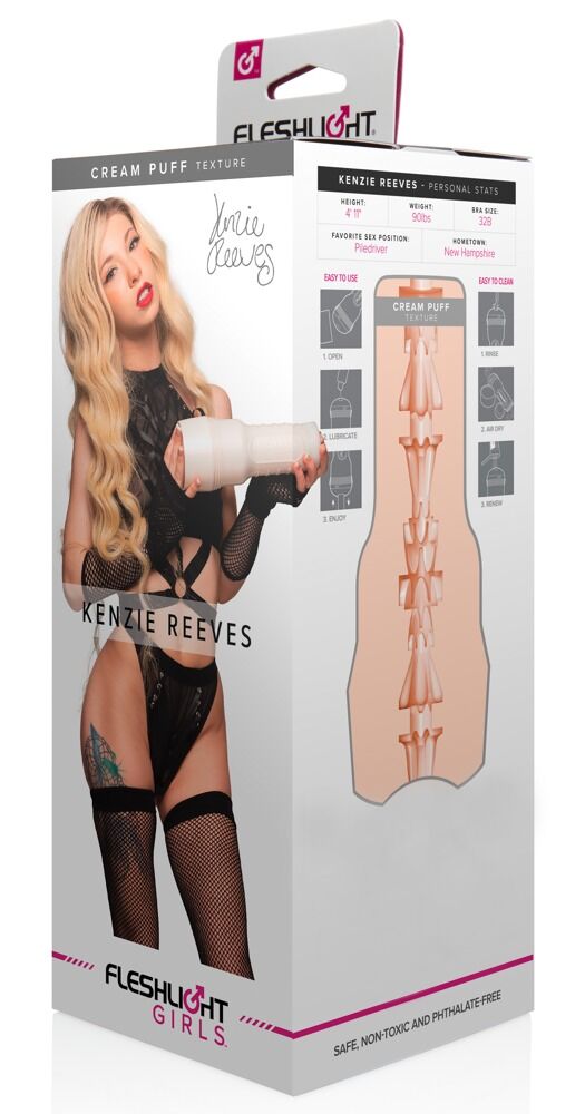 Griffiger Masturbator Kenzie Reeves Creampuff von Fleshlight in diskreter Taschenlampen-Optik mit original abgeformter Vagina-Öffnung von Erotikstar Kenzie Reeves. Und auch das sehr abwechslungsreich strukturierte Innenleben mit verschiedenen Durchmessern kommt der engen Vagina von Kenzie ganz nah und sorgt für eine intensive, orgasmuswirksame Massage beim Handjob. Die Innensleeve aus hautähnlichem super softem Material ist neben der Öffnung mit einem Autogramm von Kenzie versehen und lässt sich zur Reinigung leicht aus dem Masturbator entnehmen.