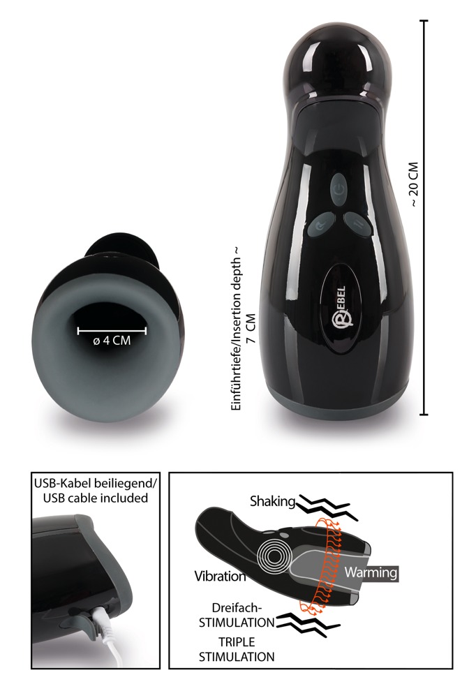 Masturbator mit 3 Funktionen. Der Masturbator verfügt über Vibration, Heizfunktion und Auf-und-ab-Bewegung. Die Steuerung erfolgt über 3 Knöpfe zur getrennten Steuerung der Funktionen. Vibration in 7 Modi, Auf-und-ab-Bewegung in 7 Geschwindigkeiten, Heizfunktion bis 40 °C. Der Sleeve ist fest integriert und nicht aus dem Gehäuse herausnehmbar. Wiederaufladbar mit beiliegendem USB-Ladekabel. Schwarz. Gesamtlänge 20 cm, Einführtiefe 7 cm, Ø 4 cm. Silikon mit PU-Beschichtung, ABS.