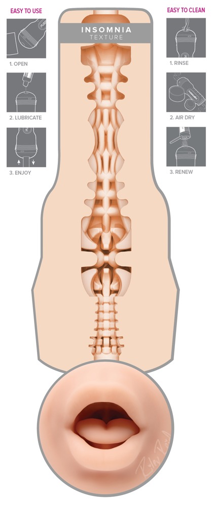 Griffiger Masturbator Riley Reid Insomnia (Mouth) von Fleshlight in diskreter Taschenlampen-Optik mit original abgeformter Mund-Öffnung von Erotikstar Riley Reid. Innen mit intensiven Strukturen für ein realistisches Deep-Throat-Vergnügen beim Handjob. Die Innensleeve aus hautähnlichem softem Superskin-Material ist neben der Mundöffnung mit einem Autogramm von Riley versehen und lässt sich zur Reinigung leicht aus dem Masturbator entnehmen.
