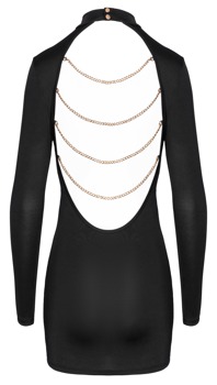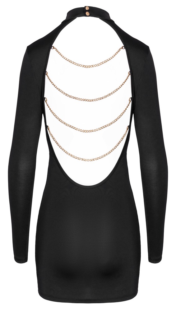 Schwarzes Minikleid von Cottelli PARTY in enger taillierter Schnittführung mit langem Arm. Atemberaubend großer Rückenausschnitt mit 4 goldfarbenen Ketten, die auch abgenommen werden können. Der Stehkragen wird im Nacken mit 2 goldfarbenen Druckknöpfen geschlossen. Das feine Stretchmaterial schmiegt sich weich an und sorgt für besten Trage- und Bewegungskomfort.