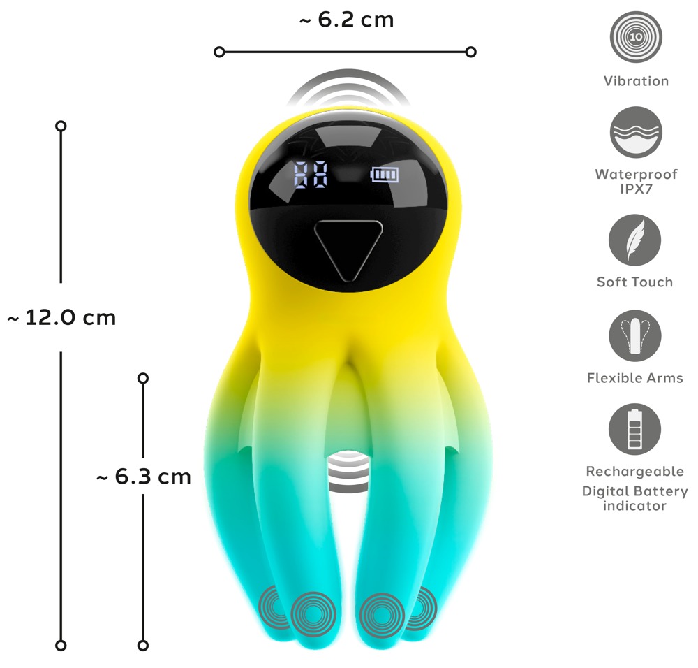 Das vibrierende Multi-Toy be Squidly von be Sassy verführt im frechen Kraken-Design mit 6 weichen, beweglichen Vibro-Armen. Gefertigt aus seidig-softem Silikon, passt es sich flexibel jedem Körper und jedem Spiel an. Die extrastarken Vibrationen verteilen sich vom Kopf bis in jede einzelne Silikon-Tentakel – perfekt, um äußere Lustpunkte wie Klitoris, Nippel & Co. sanft zu umschmeicheln und gezielt zu verwöhnen. Auch für eine stimulierende Penis- und Hodenmassage liegt der freche Multi-Vibrator perfekt in der Hand. Die innenliegenden, weichen Noppen sorgen dabei für noch intensiveres Vergnügen. Ein vielseitiges Fun-Toy für grenzenlose Spiel-Ideen – allein oder zu zweit.