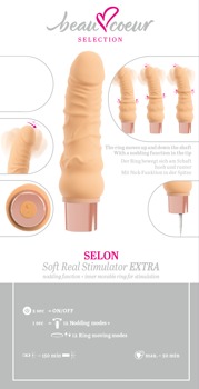 Der energiegeladene SELON Soft Real Stimulator EXTRA von beau cœur kommt mit seinem realistisch strukturierten Design einem echten Penis täuschend nah – und fühlt sich auch genauso streichelweich und seidig an! Bequem per Knopfdruck startet der SELON dann seine kraftvolle Action mit prickelnder Vibration, intensiv nickender Eichel und sich auf und ab bewegendem Move-Massagering. Das komplette Vagina-Verwöhnprogramm! Einfach einführen und genießen …