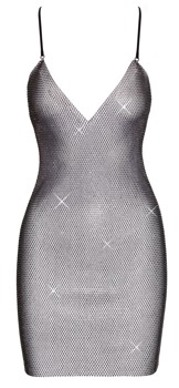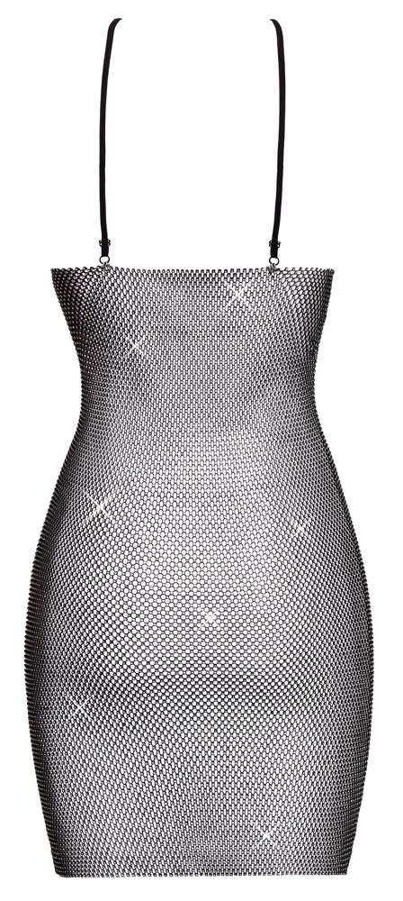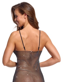 Eng geschnittenes Träger-Minikleid von Cottelli PARTY aus transparentem schwarzem Netz, über und über mit bunt funkelnden Glitzersteinchen besetzt. Vorne ein tiefer V-Ausschnitt. Die schmalen, schwarzen Träger sind passend verstellbar. Leicht elastisch für hohen Tragekomfort.