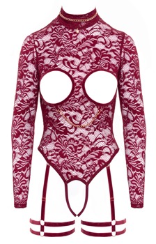 Burgundy-roter Langarm-Body von Abierta Fina mit Straps-Harness. Aus weicher Stretch-Blütenspitze verführerisch in Szene gesetzt mit Samt-Details und roségoldfarbenen Schmuckketten. Rundum weich und elastisch anschmiegsam für hohen Tragekomfort. Im zeigefreudigen Ouvert-Style mit Cut-outs für die Brüste und einladend offenem Schritt. Im Rücken verführt der Spitzenbody zusätzlich mit einem schönen runden Ausschnitt. Die Herz-Schmuckkette vorne am Stehkragen (mit Hakenverschluss) ist abnehmbar, genauso wie die Karabinerkette an den Ringen unter den Brüsten. Auch die verstellbaren Strapse und Schenkelbänder sind vom Spitzenbody abnehmbar.