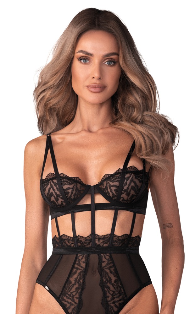Schwarzer Body ouvert Hersis von Obsessive aus zarter Spitze mit transparenten Einsätzen. Weich und elastisch in extravaganter Riemen-Optik. Mit Bügel-Cups für ein schönes Dekolleté. Die raffinierten Träger und der BH-Hakenverschluss im freien Rücken sind passend verstellbar. Der aufregend po-freie Einteiler ist zusätzlich hinten in der Taille mit einer Schmuckschließe versehen. Die Strings im komplett offenen Schritt sind ebenfalls passend verstellbar.