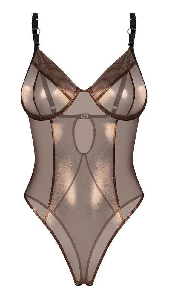 Body ouvert Soranna von Obsessive im knappen Rio-Style mit hohen Beinausschnitten. In bronzefarbener Semitransparenz mit edlem Schimmer. Schwarze Details setzen stylische Akzente. Rundum elastisch und weich anschmiegsam für besten Tragekomfort. Mit Bügel-Cups und kleinem Verschluss im Rücken. Die schwarzen Träger sind passend verstellbar. Im Schritt verführerisch offen.