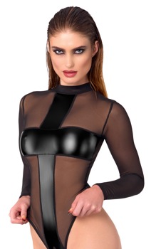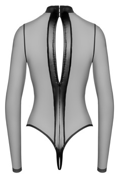 Exklusiver schwarzer Langarm-Body ouvert von Noir in aufregender Transparenz. Mit raffiniert platzierten, blickdichten Einsätzen im Powerwetlook: Vorne mittig und quer über den Brüsten ein Streifen (wie ein Kreuz) und hinten mittig ein Streifen. Alles im kurvenbetonenden Style mit kleinem Stehkragen. Rundum elastisch und weich anschmiegsam für höchsten Tragekomfort. Im Rücken geschlitzt, Stehkragen im Nacken zum Knöpfen. Im Schritt verführerisch offen.