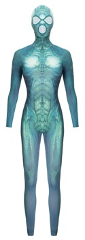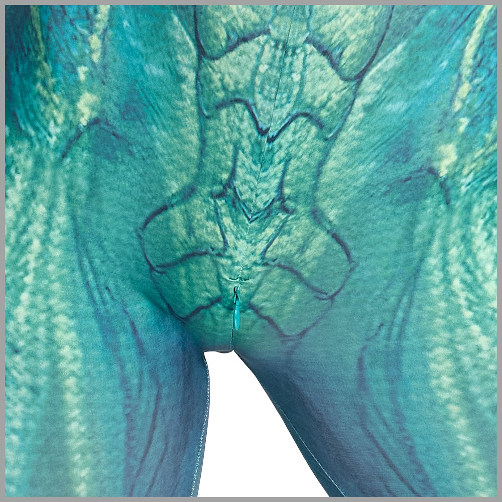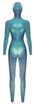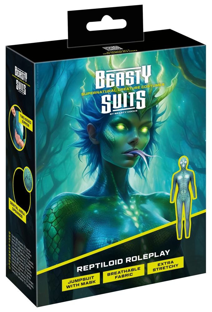 Hauteng geschnittener taillierter Langarm-Overall von Beasty Suits mit angenähter Kopfmaske. In grün-blauer Fantasy-Reptilien-Optik – schmiegt sich weich und hochelastisch an wie eine zweite Haut. Maximaler Tragekomfort! Mit feinem, hinten eingearbeitetem Reißverschluss zum leichten An- und Auskleiden. Kopfmaske mit einzeln paspelierten Öffnungen für Mund und Augen.