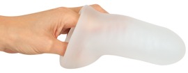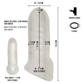 Die geschlossene Thickening Sleeve with Ball Ring Size M von REBEL vergrößert den Penis schnell und einfach für ausfüllende Lustmomente. Die elastische Transparent-Penishülle wird einfach über das Glied gestreift. Schon ist der Penis rundum 1,3 cm dicker und länger! Die inneren Rillen sorgen dabei für stimulierende Reibung und rutschfesten Sitz. Der dehnbare Hodenring bietet aufregenden Zug und sichert den festen Halt der Hülle. Auch beim wildesten Liebesspiel!
