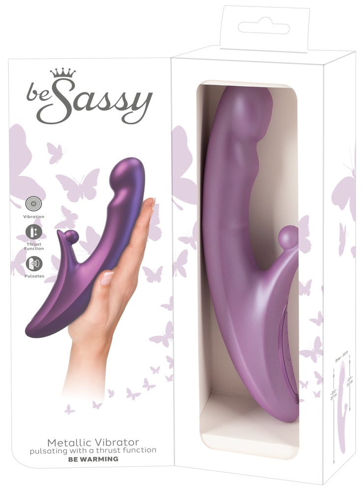 Der stylische Metallic Vibrator be Warming von be Sassy verwöhnt innen und außen zugleich. Der sinnlich geschwungene Massageschaft stößt mit seinem pulsierenden Vibrokopf in der Vagina immer wieder zu – und nimmt insbesondere die G-Zone ins lustvolle Visier. Gleichzeitig stimuliert die Klitoris-Vibrokugel den äußeren Hotspot mit prickelnden Vibes. Dazu lässt sich der Rabbitvibrator für gefühlsechten Wohlfühl-Spaß schnell erwärmen. Der edel schimmernde Metallic Vibrator aus seidig-softem Silikon ist leicht einführbar und gleitet wie von selbst zu den Hotspots. Ein leidenschaftlicher Doppelplayer für neue Höhepunkte!