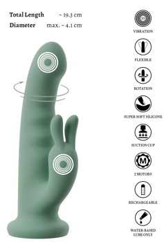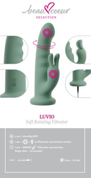 Handlicher, sinnlich designter LUVIO Soft Rotating Vibrator von beau cœur mit Saugfuß. Mit seinen 2 Motoren verwöhnt der leise Rabbitvibrator innen und außen zugleich. Der mit sanften Rillen strukturierte Schaft rotiert mit seinem Vibrokopf in der Vagina für eine tiefgehende Stimulationsmassage. Dazu verwöhnt das flexible Vibro-Bunny intensiv die Klitoris und Vulva.