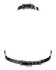 Schwarzer Ouvert-BH A740 von Obsessive aus weichen Lederimitat-Riemen mit dekorativen Ringen. Der Unterbrustriemen ist im Rücken mit Schnallenverschluss passend verstellbar, genauso wie der Neckholder.