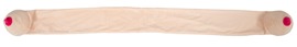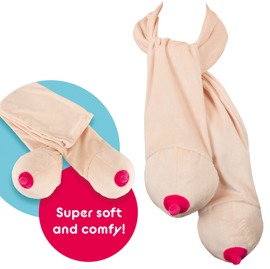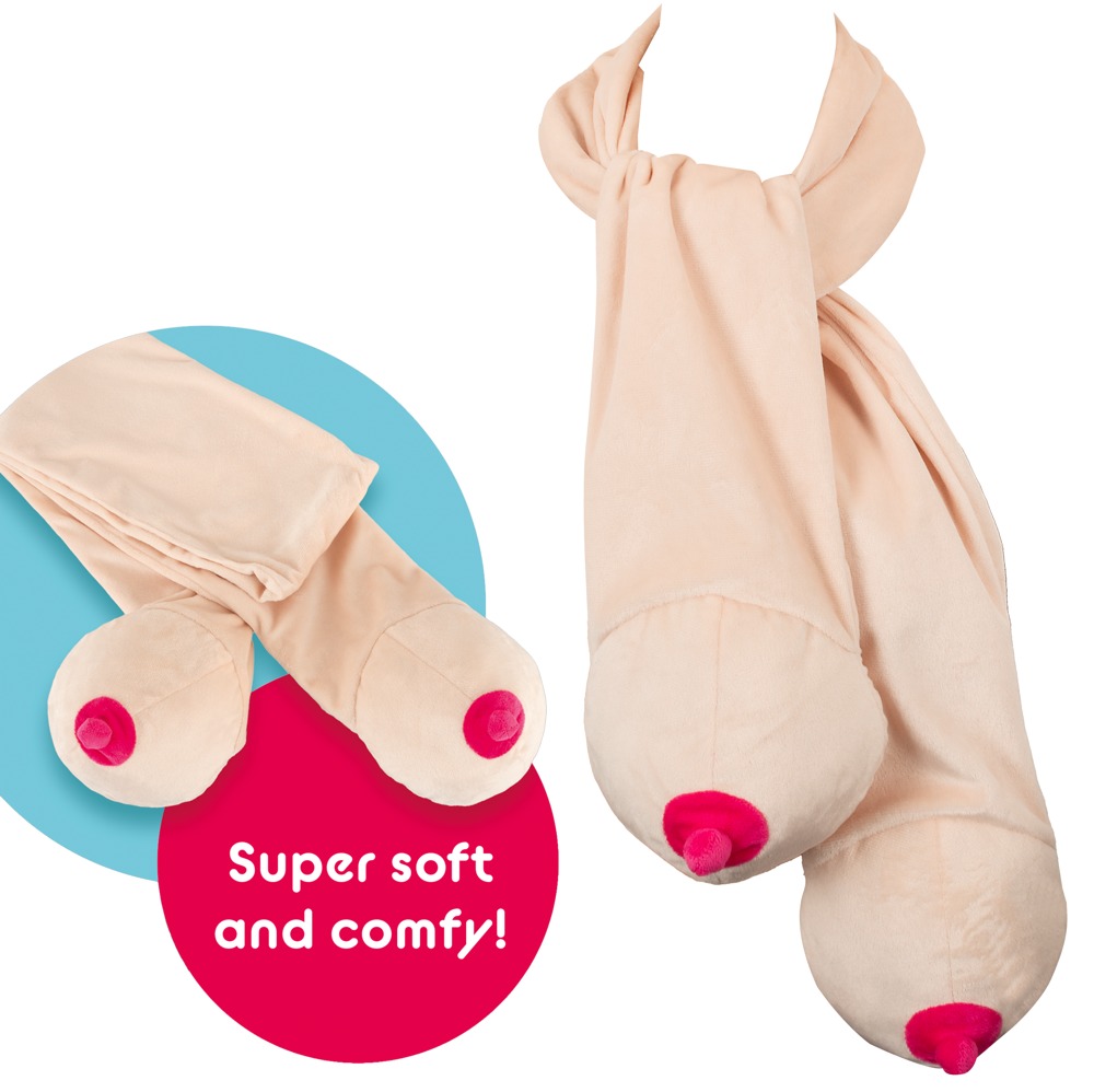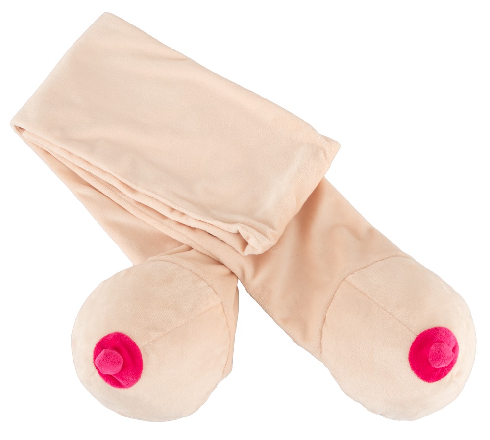 Nudefarbener Busen-Schal mit weicher praller Brust und pinkfarbenem Plüschnippel an jedem Ende. Kuschelig weich, leicht und flauschig. Ausreichend lang, um ihn passend um den Hals zu schlingen, damit die Brüste auf richtiger Höhe hängen. Der freche Eyecatcher für Karneval/Fasching, Partys, JGAs, Après Ski und überhaupt.