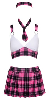 Hochwertiges 4-teiliges Schuluniform-Kostüm von Cottelli COSTUMES im pink/schwarz/weißen Karo-Look. Bestehend aus Top, Faltenröckchen, typischer Krawatte und Haarband. Top mit weißen Cups und Ringen für die breiten Träger, die im Rücken über Kreuz verlaufen. Extra kurzes Röckchen mit bequemem Stretchbund.